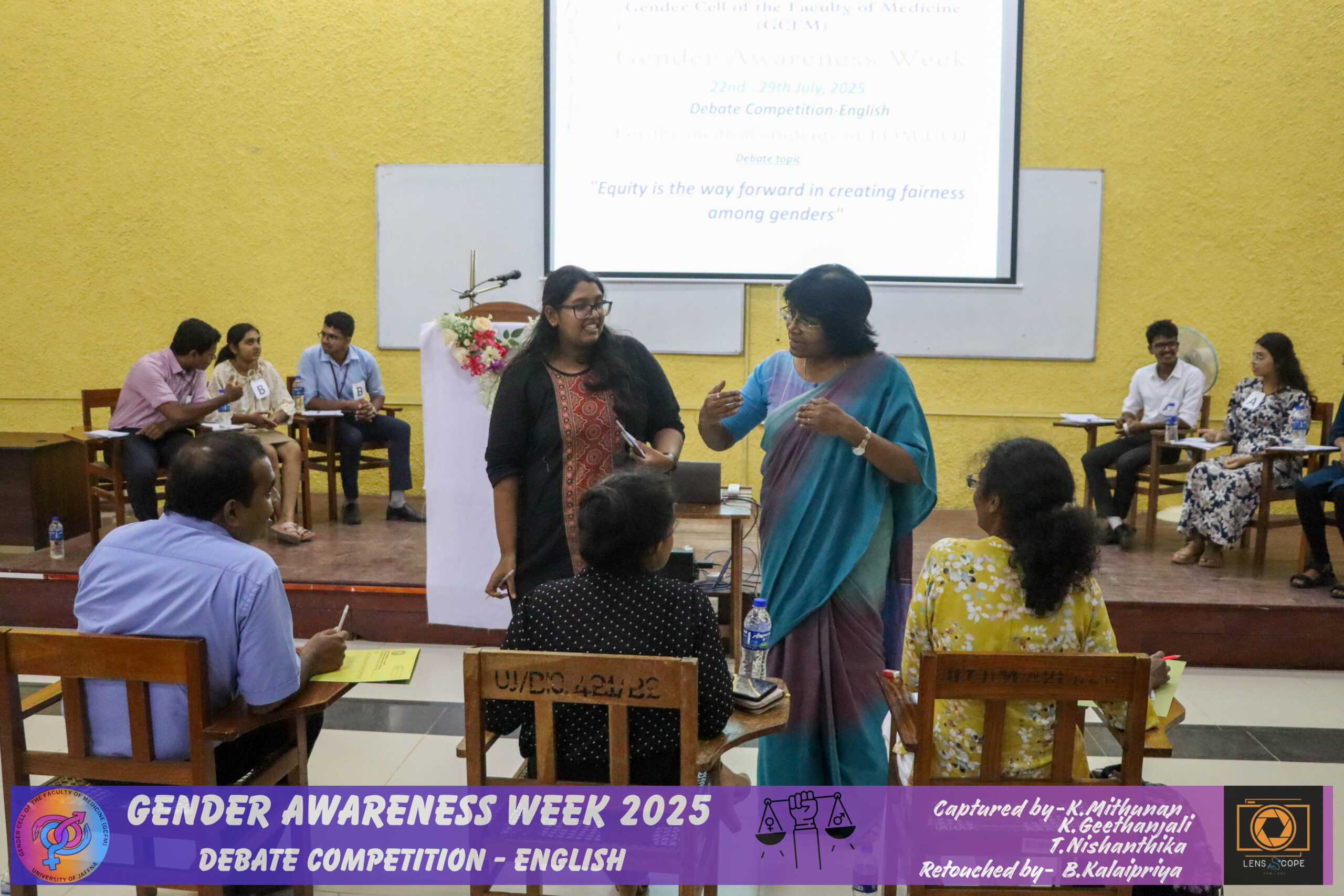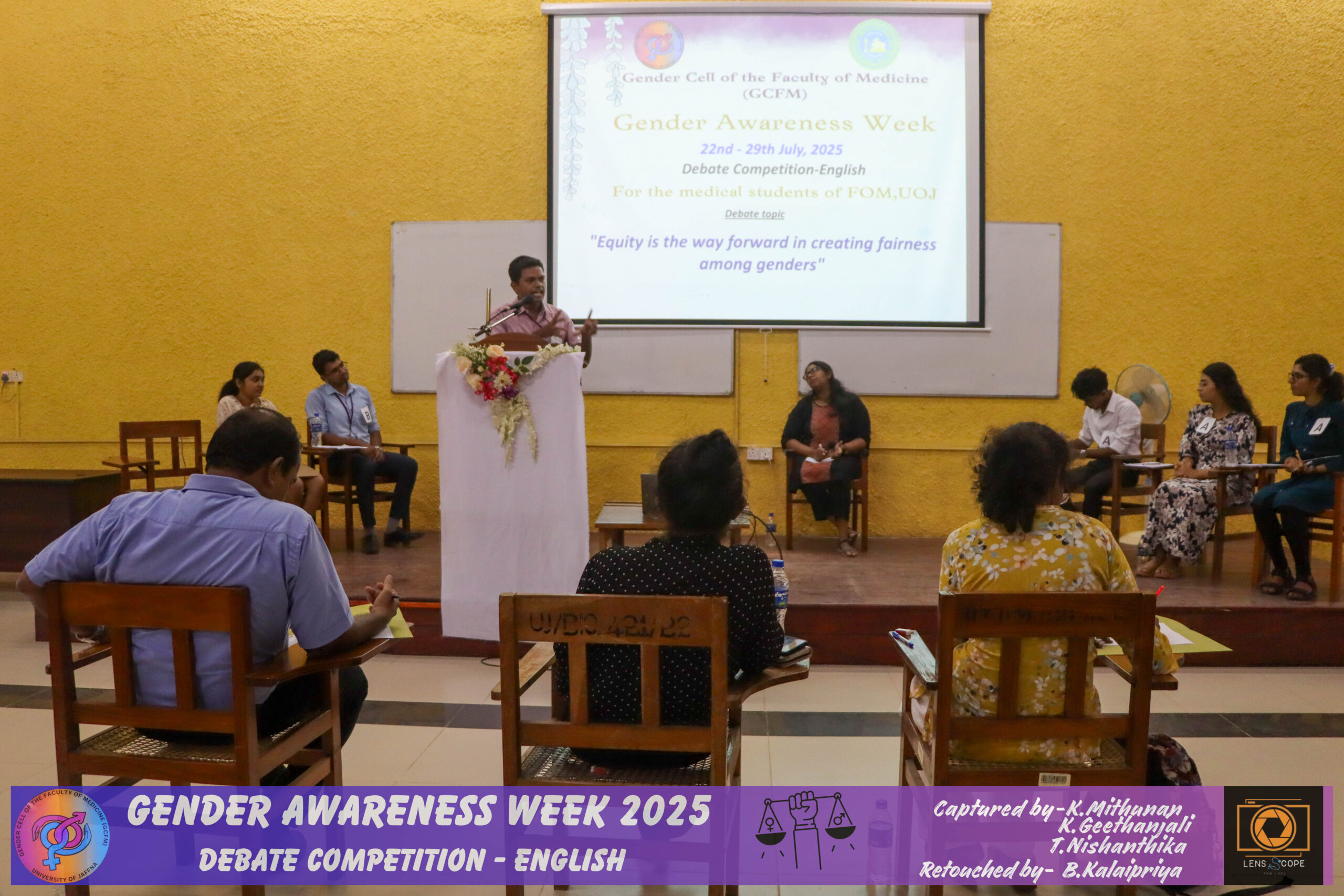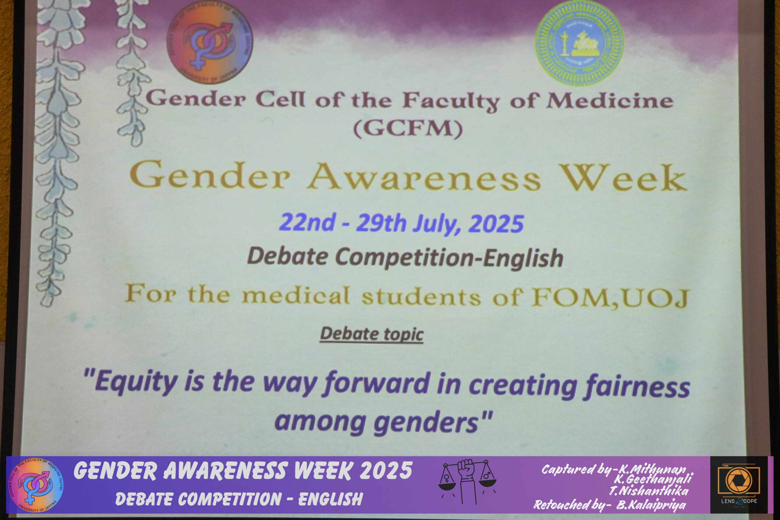 In view of improving awareness regarding gender issues and the need for gender equality and equity among the students of this faculty, the student wing of the Gender Cell of the Faculty of Medicine (GCFM), University of Jaffna, successfully conducted a gender awareness week for the students in the theme of ‘Redefining Norms, Redeeming Equality’ with the support of the GCFM staff members.