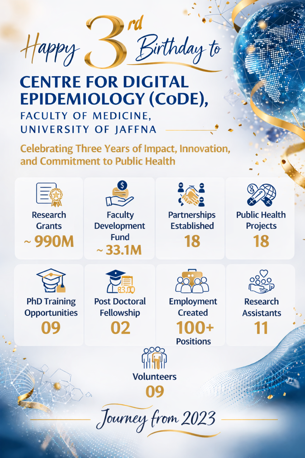 The Centre for Digital Epidemiology (CoDE) is a non-profit academic research center established in 2023 with the aim of advancing knowledge, strengthening research activities, and disseminating in epidemiology. CoDE conducts multi-disciplinary research, community engagement initiatives, training courses, and educational programmes under the umbrella of the University of Jaffna’s Faculty of Medicine.