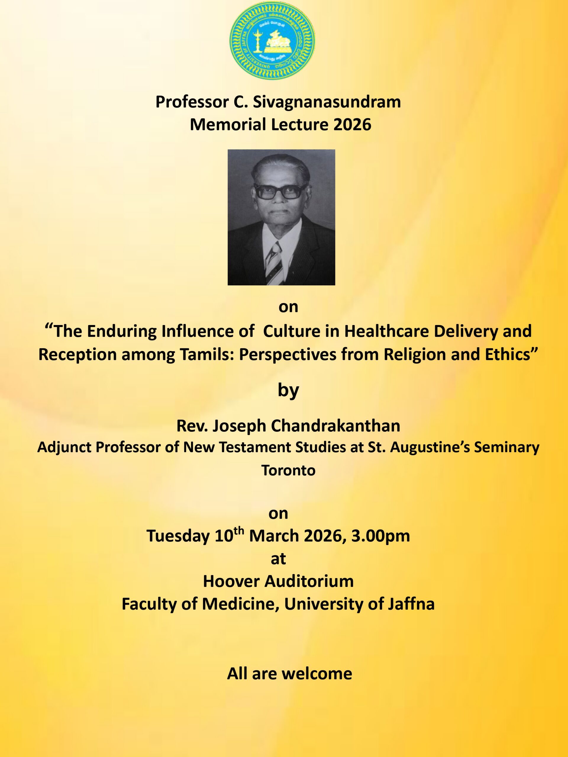 The Professor C. Sivagnanasundram Memorial Lecture 2026 will explore the enduring influence of culture on healthcare delivery and reception among Tamils, with particular attention to religious and ethical perspectives. The lecture will be delivered by Rev. Joseph Chandrakanthan, Adjunct Professor of New Testament Studies at St. Augustine’s Seminary, Toronto.